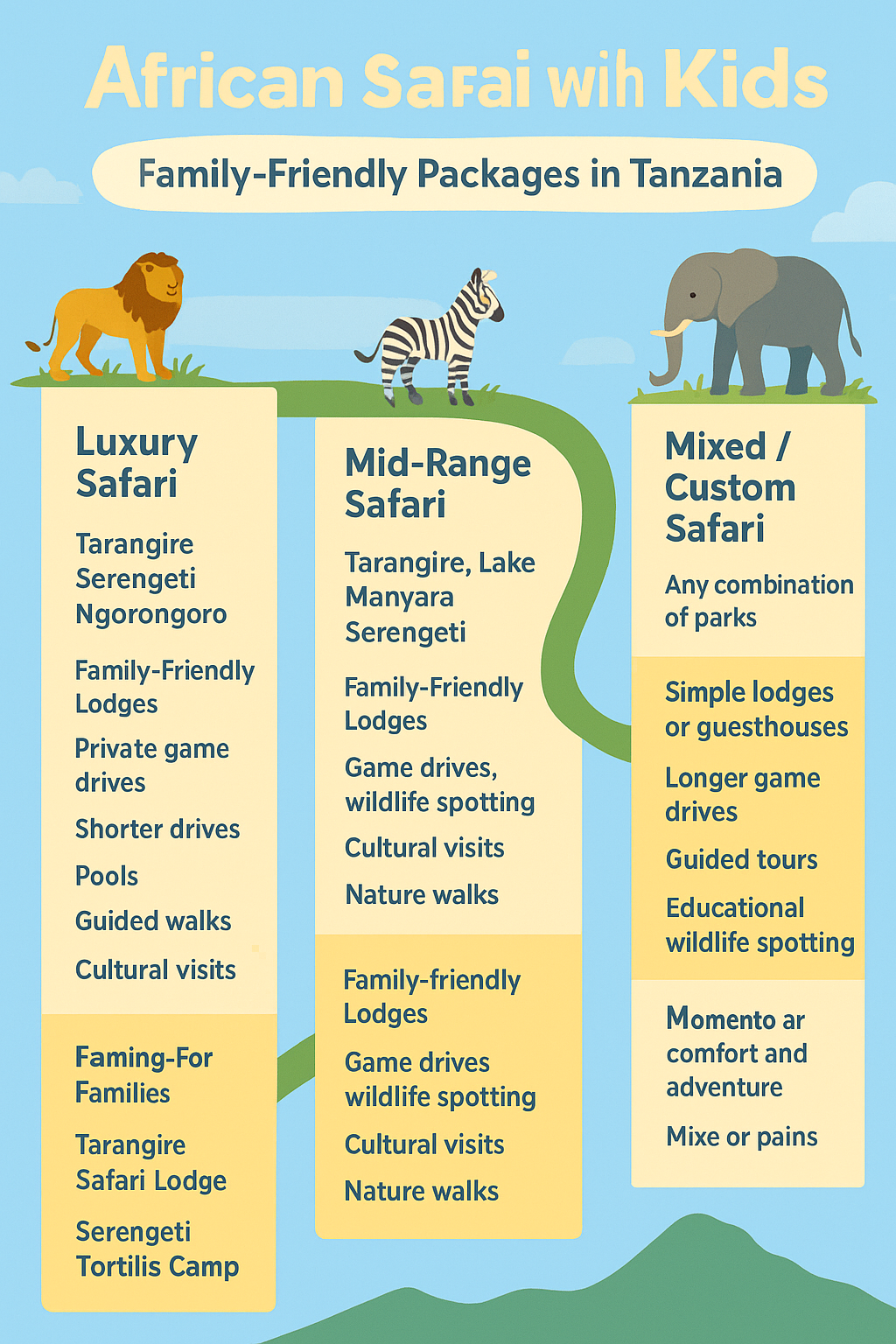 Families can also mix and match. For example, they might choose a mid-range lodge in Tarangire, a luxury camp in the Serengeti, and a simple lodge near Ngorongoro. This flexibility allows each family to customize their safari based on comfort needs, travel pace, and budget.